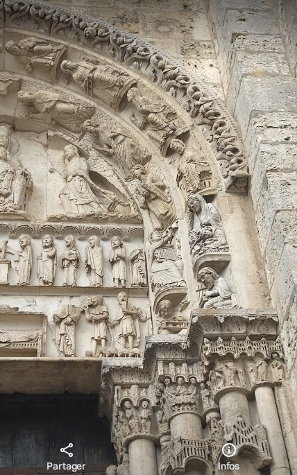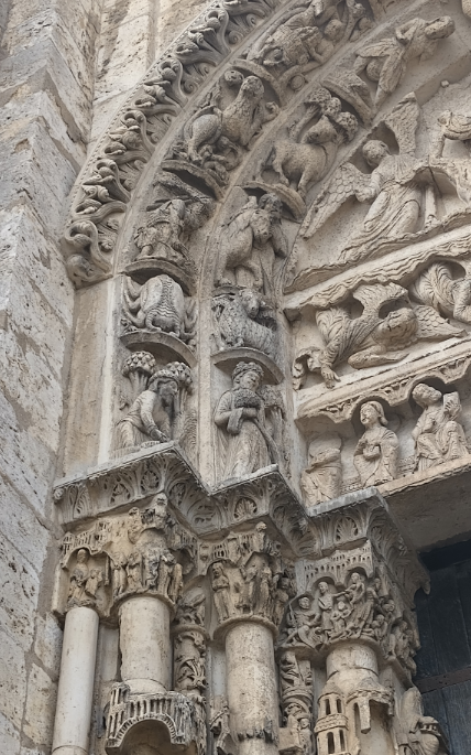 – Sur le fronton de la porte de gauche, la première figure qui apparaît tout en haut à gauche avec un visage souriant, est Dieu. Ainsi, les pèlerins sortaient de la cathédrale purifiés, sous le regard de Dieu.