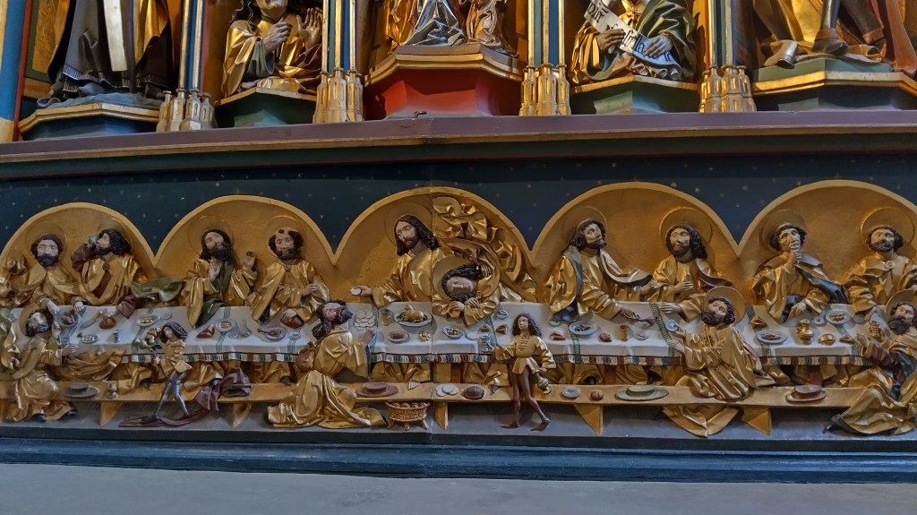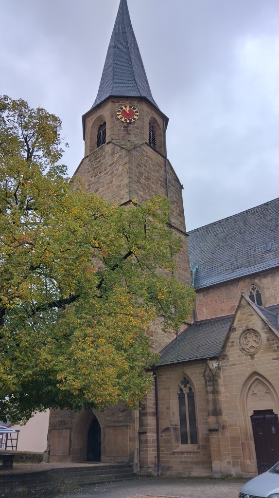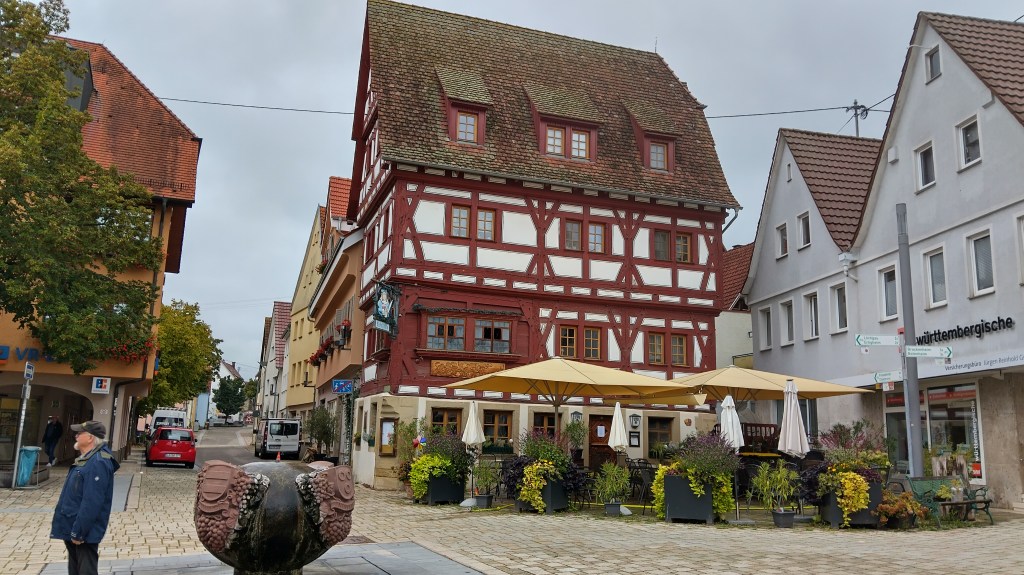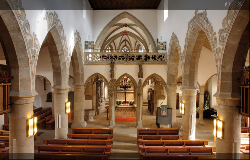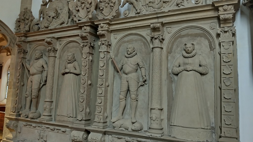 L’église de Bönnigheim est l’une des quatre dernières églises du Baden-Württemberg à posséder encore un chancel* qui sépare le prêtre des fidèles. En effet, la réforme engendrée par Martin Luther rendit cette séparation obsolète, et la plupart des lieux de cultes la supprimèrent, arguant que les croyants ne faisaient qu’une seule et même famille qu’il ne fallait pas diviser. Dans cette église encore, figure un tableau représentant un couple et leurs 53 enfants. L’épouse donna naissance à des jumeaux 12 fois, et à plusieurs triplés. Beaucoup de ces enfants moururent en bas âge, et les plus âgés ne dépassèrent pas l’âge de 9 ans. Le couple lui même mourut sans enfant. L’empereur Maximilien vint lui même s’enquérir de la véracité de cette histoire, qui lui fut confirmée par la juridiction locale. Le clocher de cette église s’élance vers le ciel en faisant un tour sur lui même, lui donnant cet aspect tournoyant. La légende dit qu’il en est ainsi à cause du mariage en l’église d’une jeune fille qui n’était plus vierge. Le clocher reprendra son aspect droit lorsque q’une vraie vierge s’y mariera.