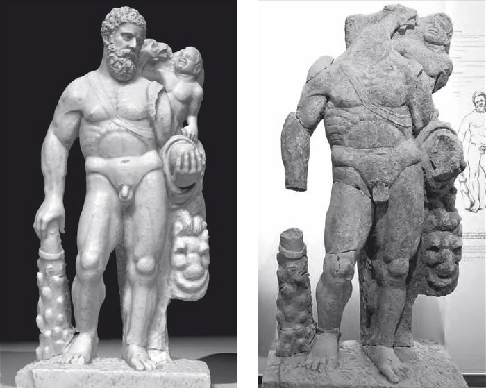 Il est représenté avec une massue dans la main droite et une pomme des Hespérides dans la main gauche. Il porte la peau de lion sur l’avant-bras gauche et la ceinture de son carquois passe sur sa poitrine. La sculpture est associée à la représentation d’une scène de sa petite enfance : sur son épaule gauche, Hercule, alors âgé de huit mois, étrangle les deux serpents que sa belle-mère a placés dans son berceau. Cette association avec la scène de l’étranglement des serpents est une nouvelle création singulière d’un sculpteur sur pierre régional.